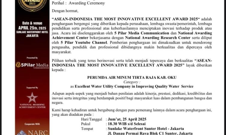 Penyerahan penghargaan sendiri akan dilaksanakan dalam acara ASEAN-INDONESIA THE MOST INNOVATIVE EXCELLENT AWARD 2025 pada 25 April 2025 di Sunlake Waterfront Sunter Hotel, Jakarta.